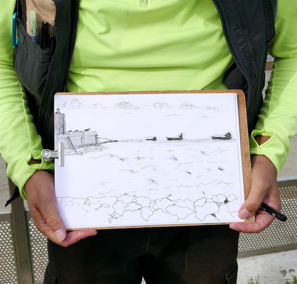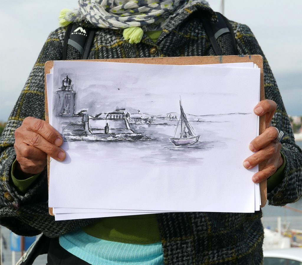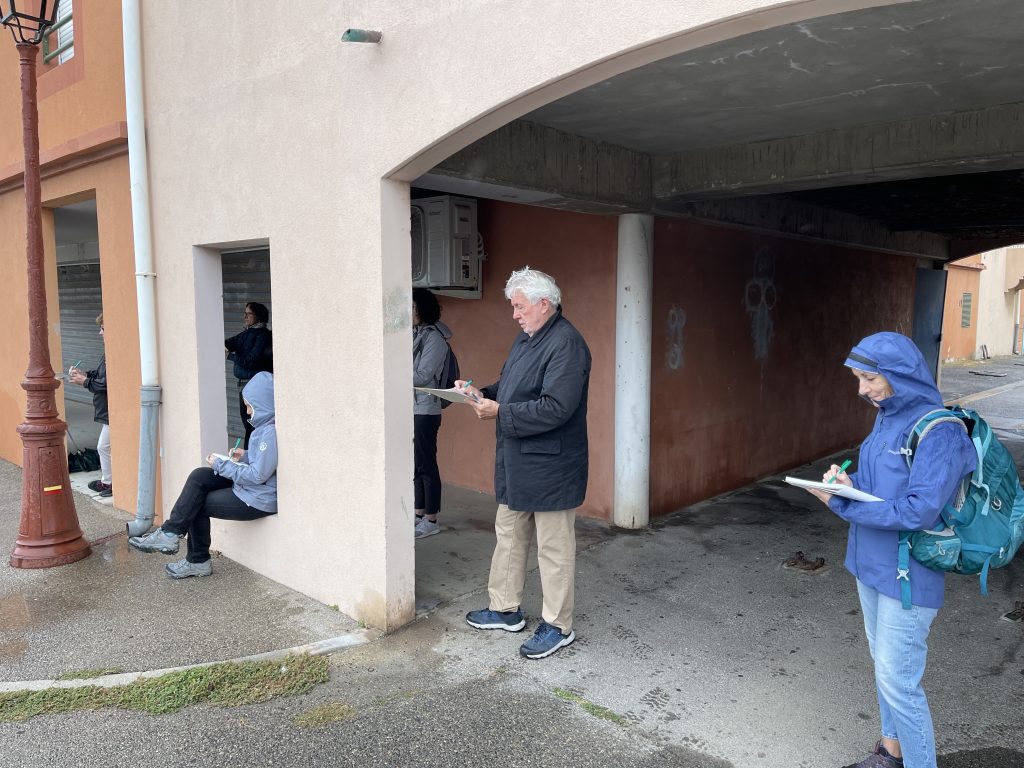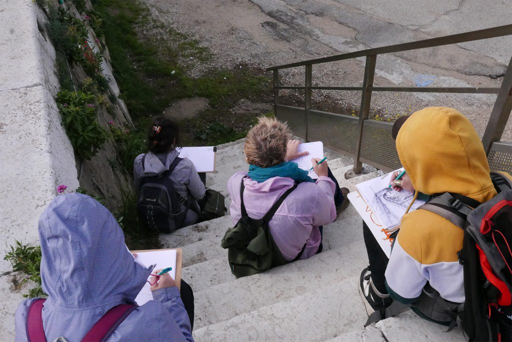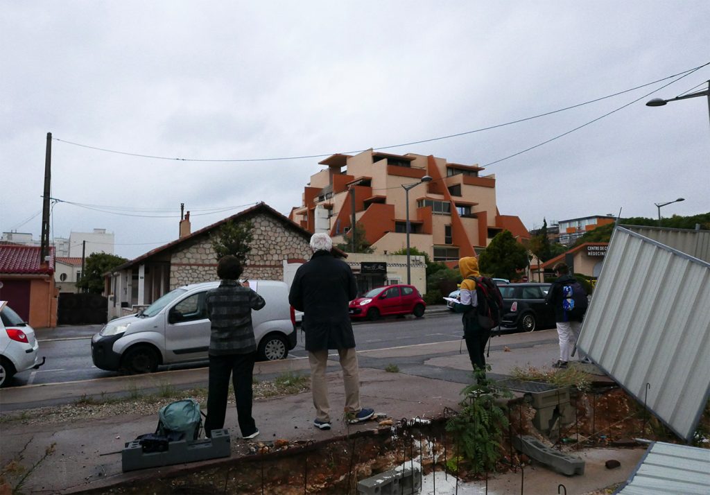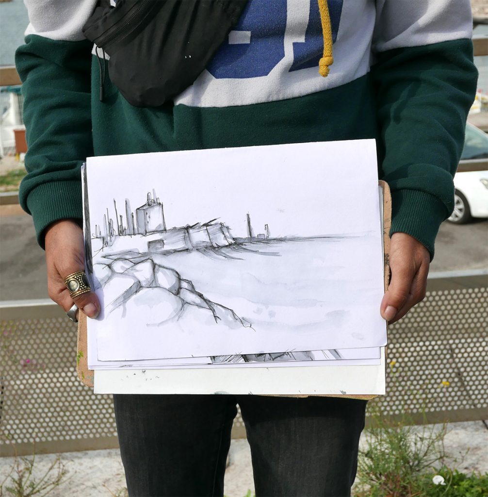 Chaque participant est accompagné dans la pratique du dessin sur le vif par un mot, un conseil pour des interprétations personnelles des points de vue. Malgré une hésitation, une maladresse dans son tracé, le dessin n’est que justesse. » Sébastien MARIAT