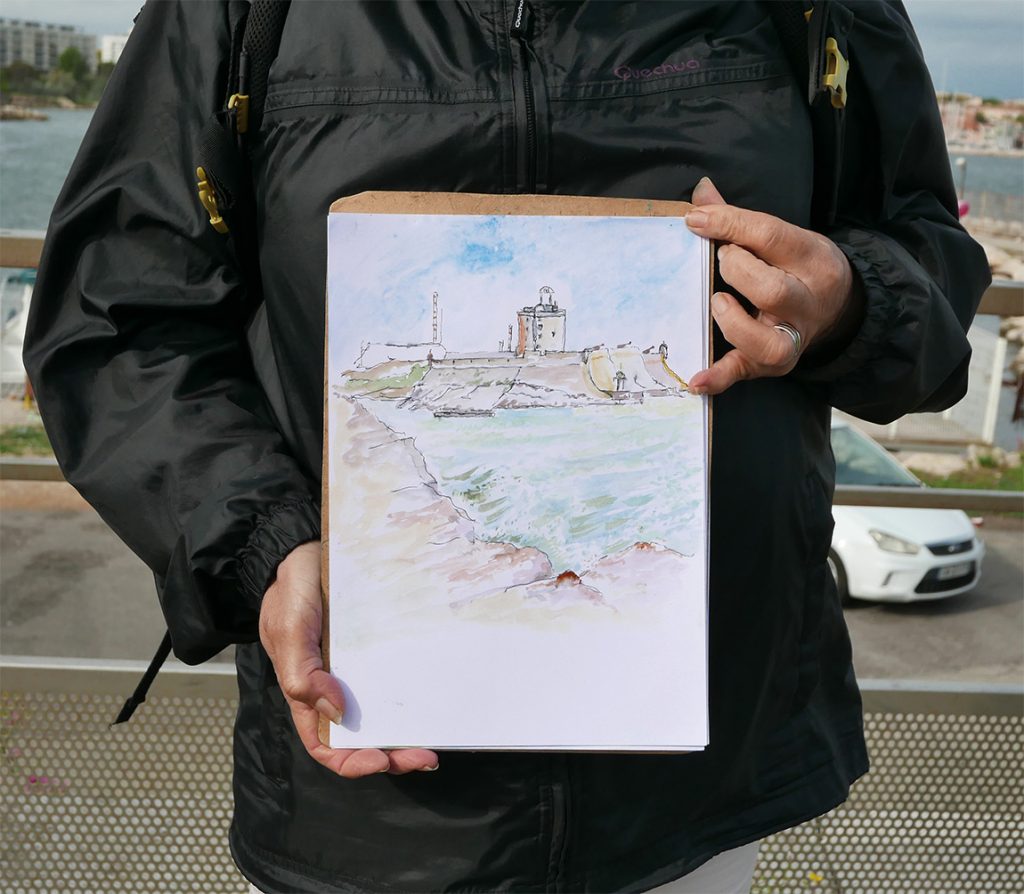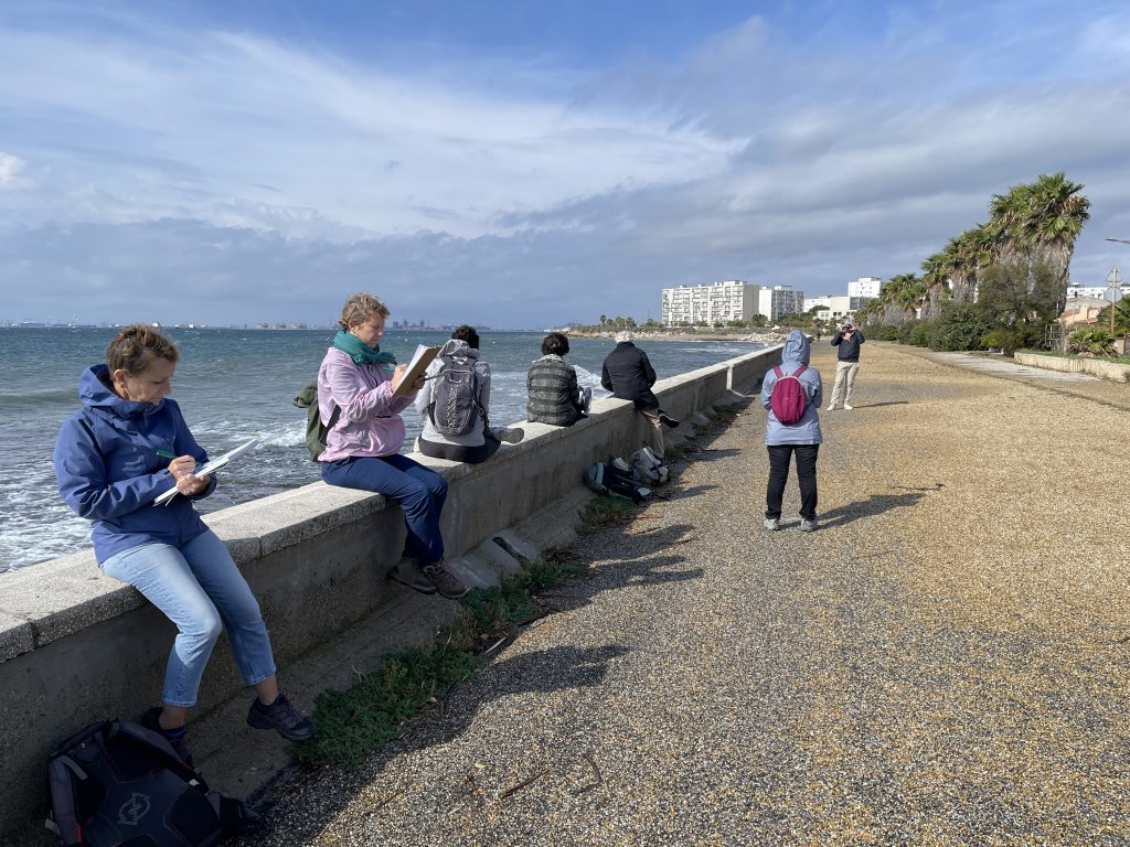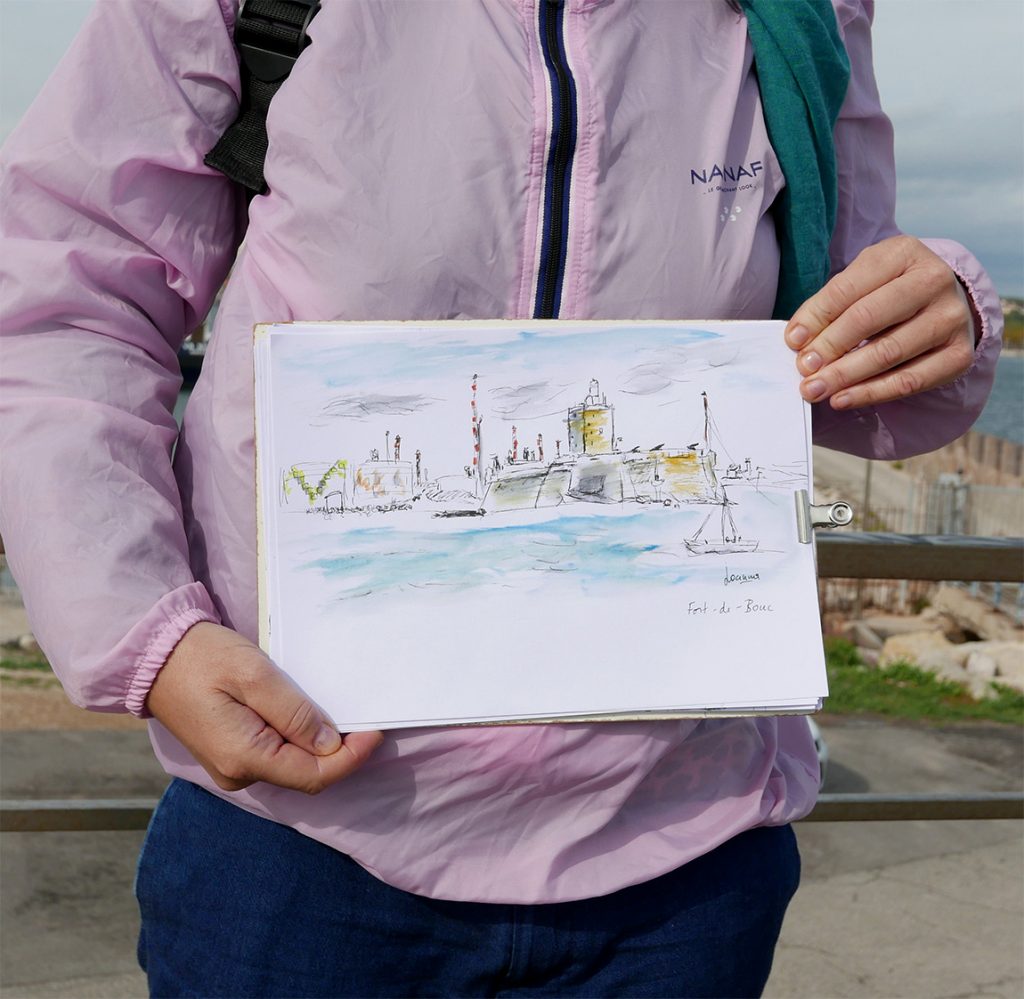 Dimanche 19 octobre. Au départ de la gare, à la recherche d’un point de vue sur le Fort de Bouc, nous marchons vers un paysage tout en vertical. La tour de la Leque guide notre regard pour une traversée vers un ensemble pavillonnaire qui nous offre un panorama sur le golf de Fos…